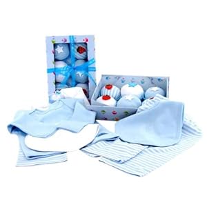 These scrummy pyjama cupcakes from Baby Blooms are actually cleverly disguised pyjamas and two pairs of bibs. A delightful ribbon-tied presentation box contains two pair of pyjamas. Coordinating long-sleeved blue T-shirt (100% cotton) mean the lucky wearer will also look good enough to eat. Available in size 0-6 months and 6-12 months. 2 pair pajamas + 2 Bibx, incl 2 solid colour long sleeve top and 2 stiped colour/white bottoms, 1 solid colour bib, 1 white bib, 100% cotton